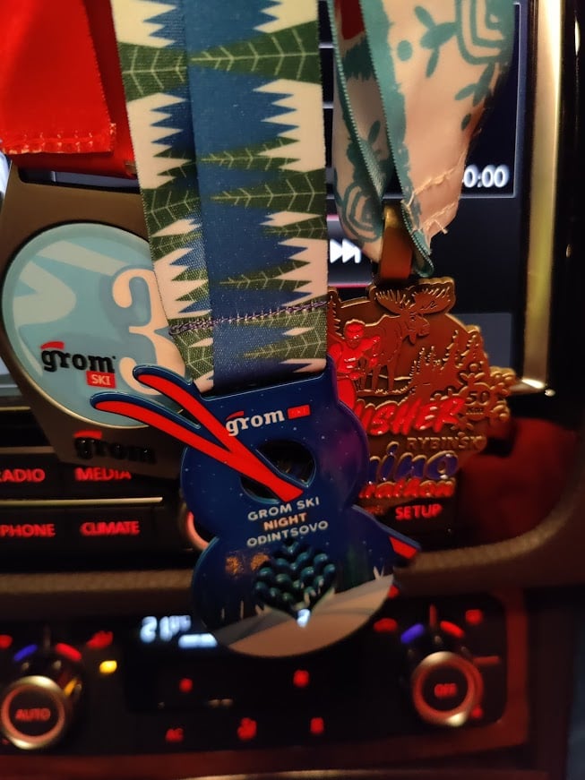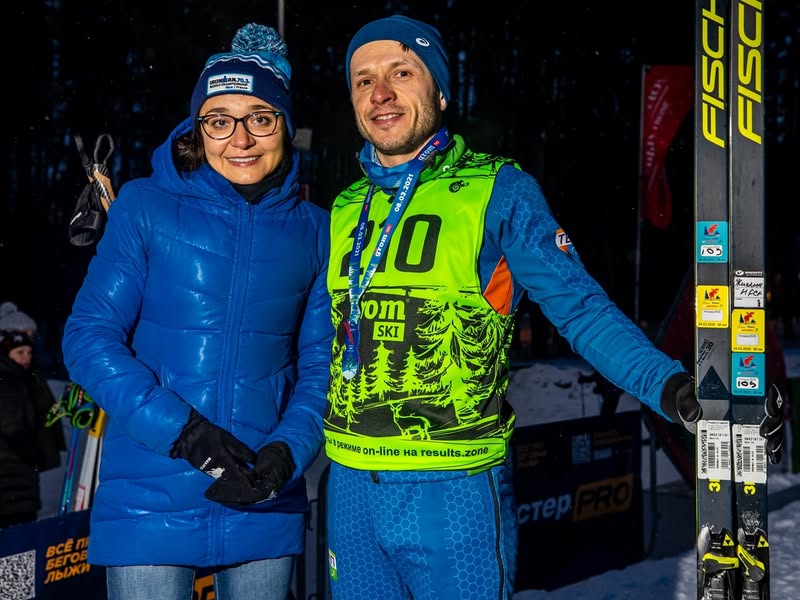 P.S.S. на третий день был ночной гром. Дочка проехала свои 1,2 км, набралась впечатлений и красивых фото. Было все, от слез "все уехали, а я осталась" до торжественного пересечения финиша в бодром настроении и обещанием "100 раз потренироваться к следующему старту". Далее экспресс заброска дочки к бабушке, к старту успел как раз. Опять же, не планировал бежать активно, лыжи не готовил, поехал в "разминке". Решил старт с первого ряда отработаю и спокойненько доеду. Отработал хорошо, с первой группой докатился до первого подъема, там от группы отвалился один товарищ, мы вместе расслабленно и покатили. В итоге через некоторое время нас догнала группа лыжников. На финальном подъеме первого круга Полина громко стала поддерживать Михаила. Понимаю, что за мной Михаил Громов (по силам у нас что-то близкое, он меня в триатлоне обгоняет, а я на лыжах пытаюсь реабилитироваться). Еду не особо быстро, но меня что-то никто обгонять не хочет. Докатились до первого подъема второго круга и там я добавил на все оставшиеся деньги. Думаю, если за мной усидят, то пропущу и уж точно спокойно доеду. Но нет, оглянулся - преследователи пропали. Кое как доехал до финиша. Труды вознаградились бронзой в АГ. На первом месте Барышников, на втором Федор Николаев (монстры из другого теста). Еще у меня был лишний слот женский - подарил Надежде, они с Максимом бросили свою лыжную тренировку где-то вдалеке от Одинцово, приехали за полтора часа в дороге, и Надя выиграла АГ. Хочешь поднять себе настроение - посмотри на чету Анфимовых - это всегда работает :)