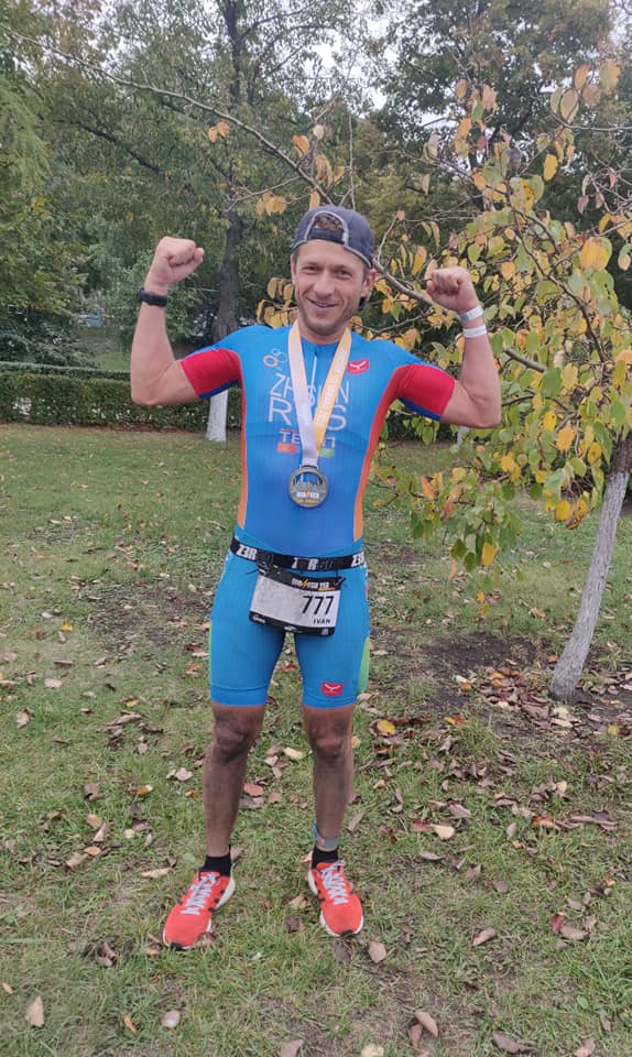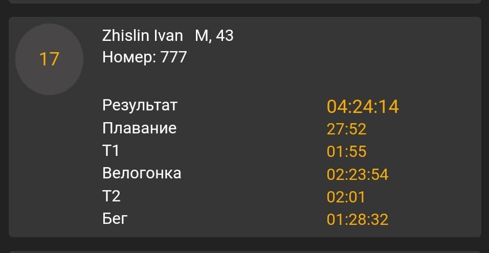 В итоге первый раз залез на тумбочку. Второе место в группе, первое у Михаила Громова. На этом старте с Михаилом счет 4:1 в его пользу. Он в группе первый на плавании, велосипеде, обоих транзитках, я за собой оставил только беговой этап.