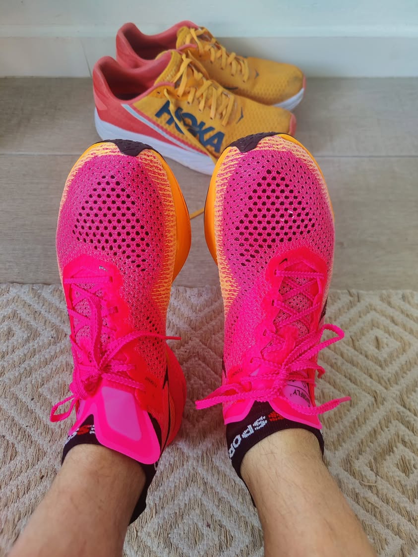На марафон поехал заранее. В Валенсию прилетел в понедельник, поселился в пригороде, гулял, красивый город, море, природа. На экспо приехал в первый день с утра, думал посмотреть какие-нибудь модные кроссовки, т.к. свои хока рокет-х и адидас бостон-8 уже порядком ушатал. На большом экспо с кроссовками было не густо, в основном от генерального спонсора NB (нью-балланс), и стоял небольшой стенд найка, там всего пара моделей включая вапорфлай-3. Их взял в руки и сразу понял - они. Вообще не рекомендуется ничего нового испытывать на стартах, но я уже на опыте более-менее понимаю по ощущениям и сомнений не было. Вечером перед стартом пробежался полчасика - веса нет совсем, такие пружинящие носки. И не ошибся, отработали они на 100%, и никаких мозолей, что редкость.